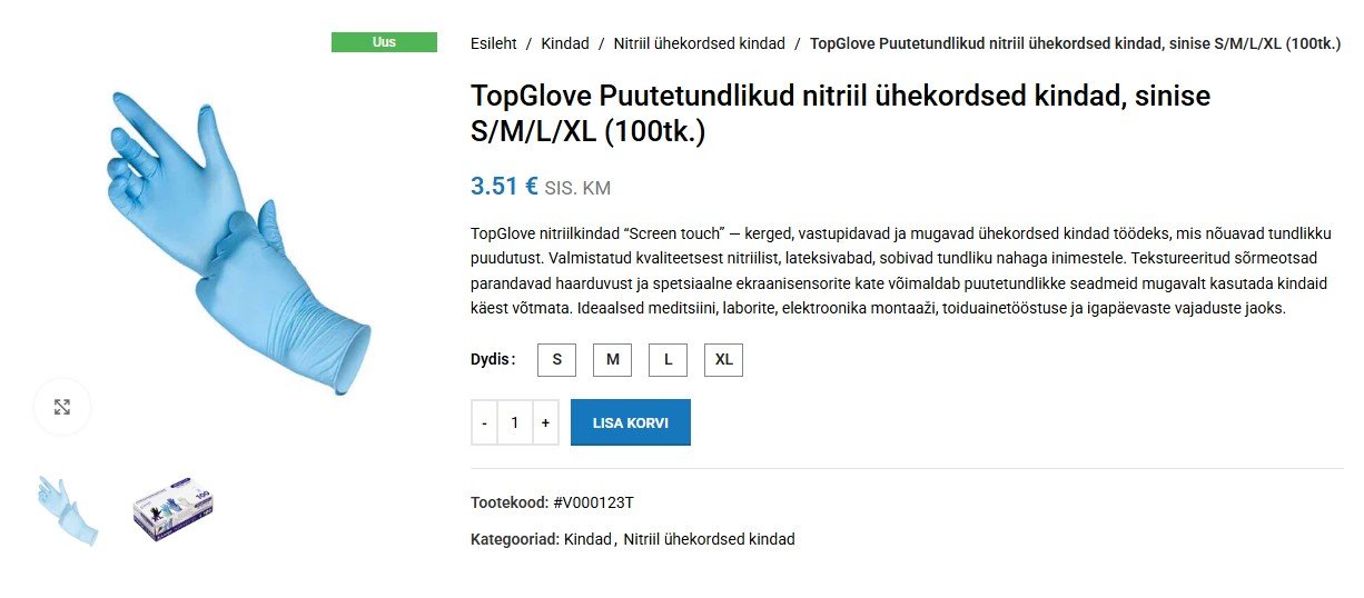 Valige tootekataloogist soovitud toode ja klõpsake sellel. Seejärel valige suurus ja kogus ning vajutage „Lisa ostukorvi“. Teie valitud toode lisatakse ostukorvi.