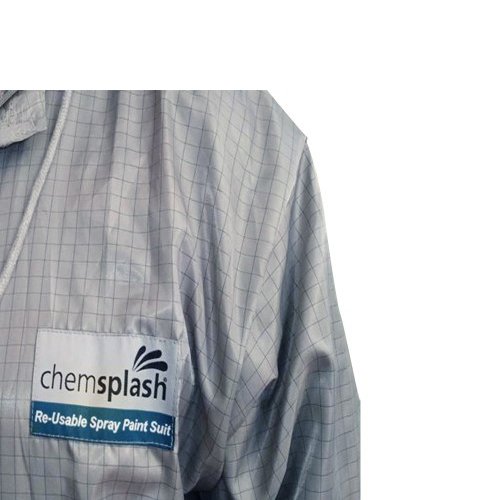 Chemsplash daugkartinio naudojimo purškiamų dažų kostiumas pagamintas iš 68GSM (+/-3GSM) 99% poliesterio ir 1% anglies tinklelio. Jis yra antistatiškai apdorotas ir mažai pūkuojantis.